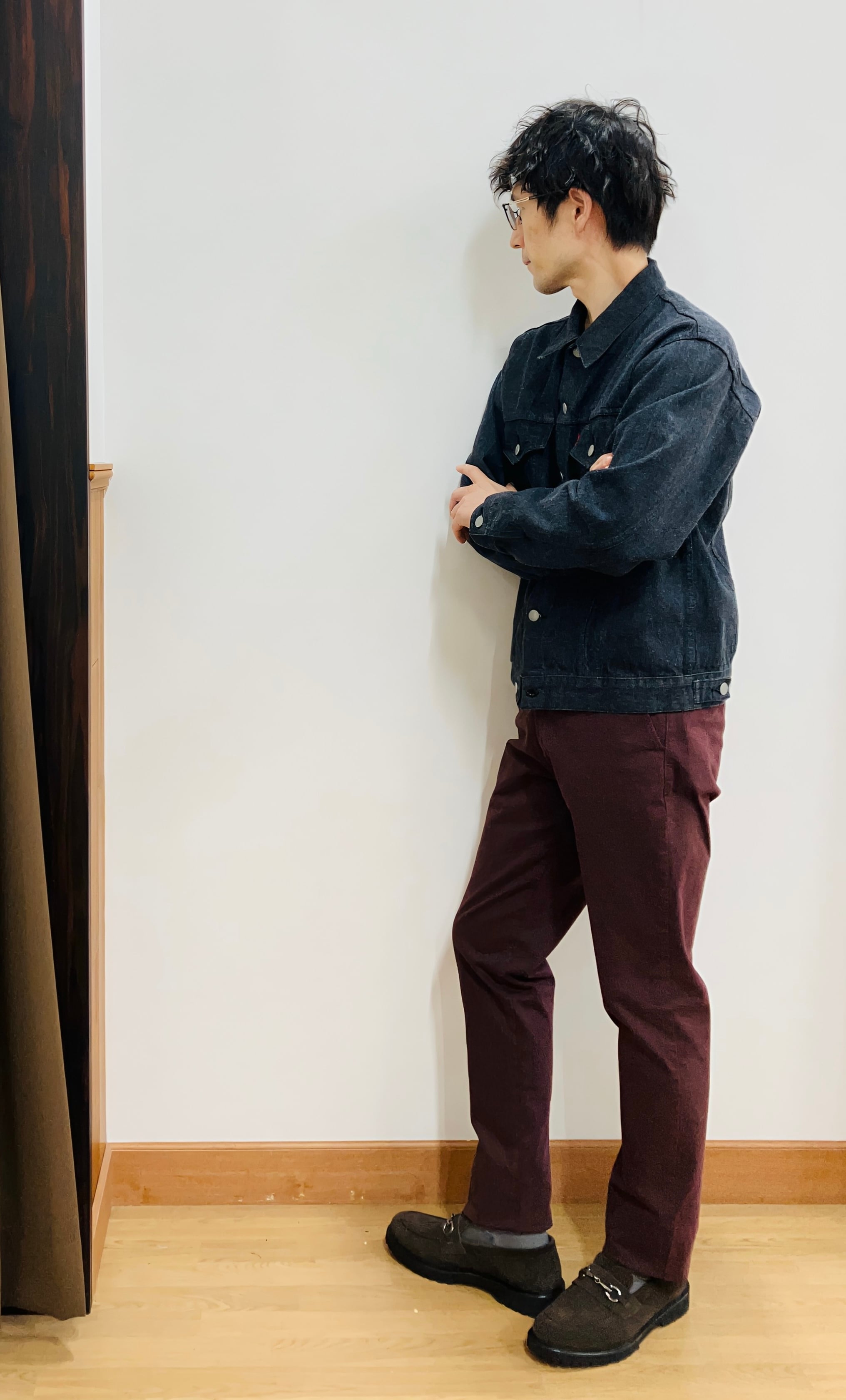 タテ色糸を糸の芯まで染めたブラックは、経年変化でヒゲが出ないキレイなグレーに変わってきます。その変化もどうぞお楽しみくださいませ。