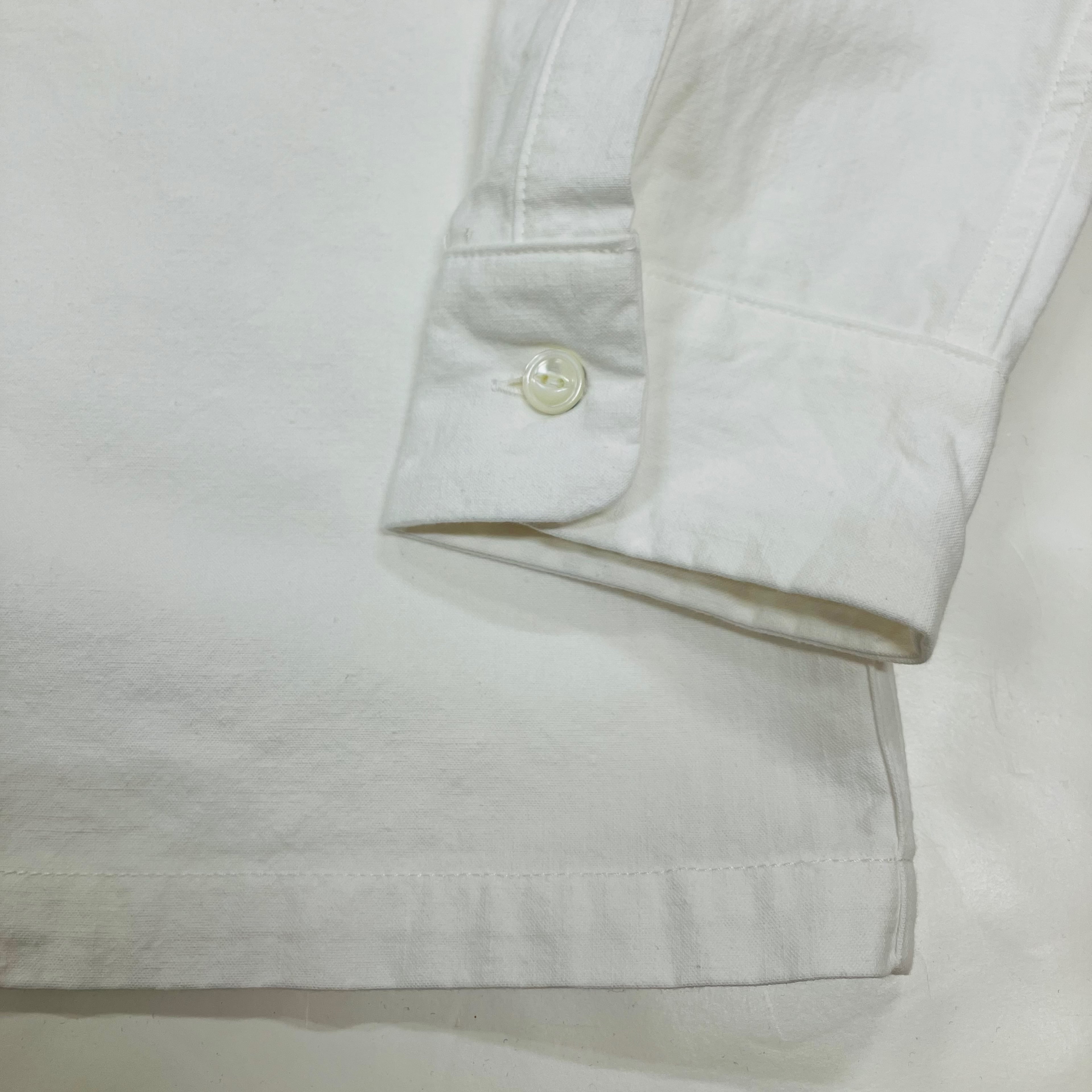 This open-collar shirt is made from a fabric that includes reclaimed cotton (fallen cotton), replicating the material shortages of earlier times. The result is a naturally uneven texture with a rugged, rustic appearance. Featuring a boxy, relaxed fit and a square-cut hem, it’s designed to be worn casually as a lightweight outer layer. Cat’s eye shell buttons add a refined touch, balancing the shirt’s rough character with an element of elegance.