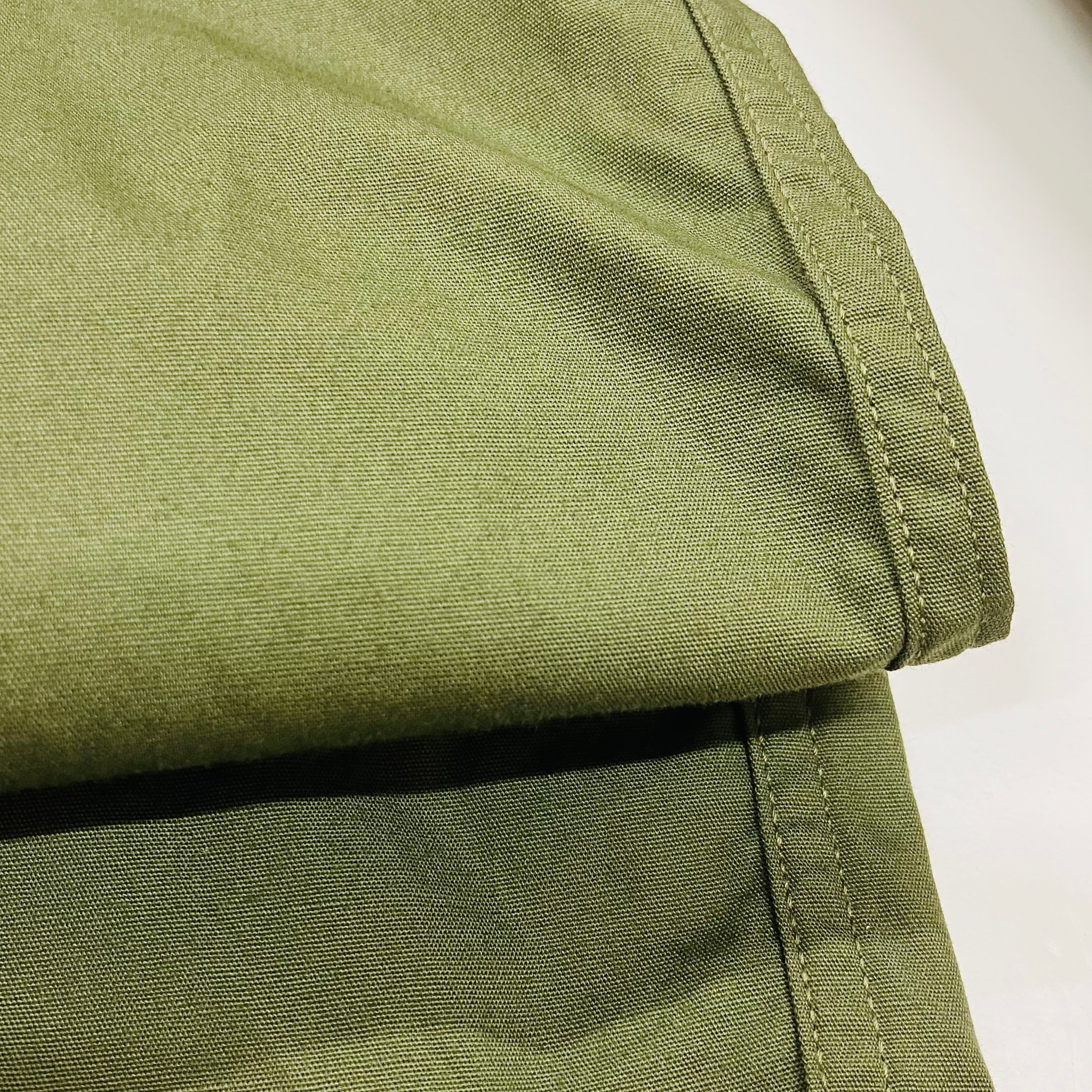 当時と同じVAT DYEで染めた米陸軍のコットンポプリンをリプロダクト。この素材を使用し、フラップ付きのオープンカラーシャツを製作。懐かしい風合いの生地感で、丈夫で、経年変化も楽しみな生地が特徴。少しゆとりのあるボックス型のシルエットでコーディネートし易い一着です。