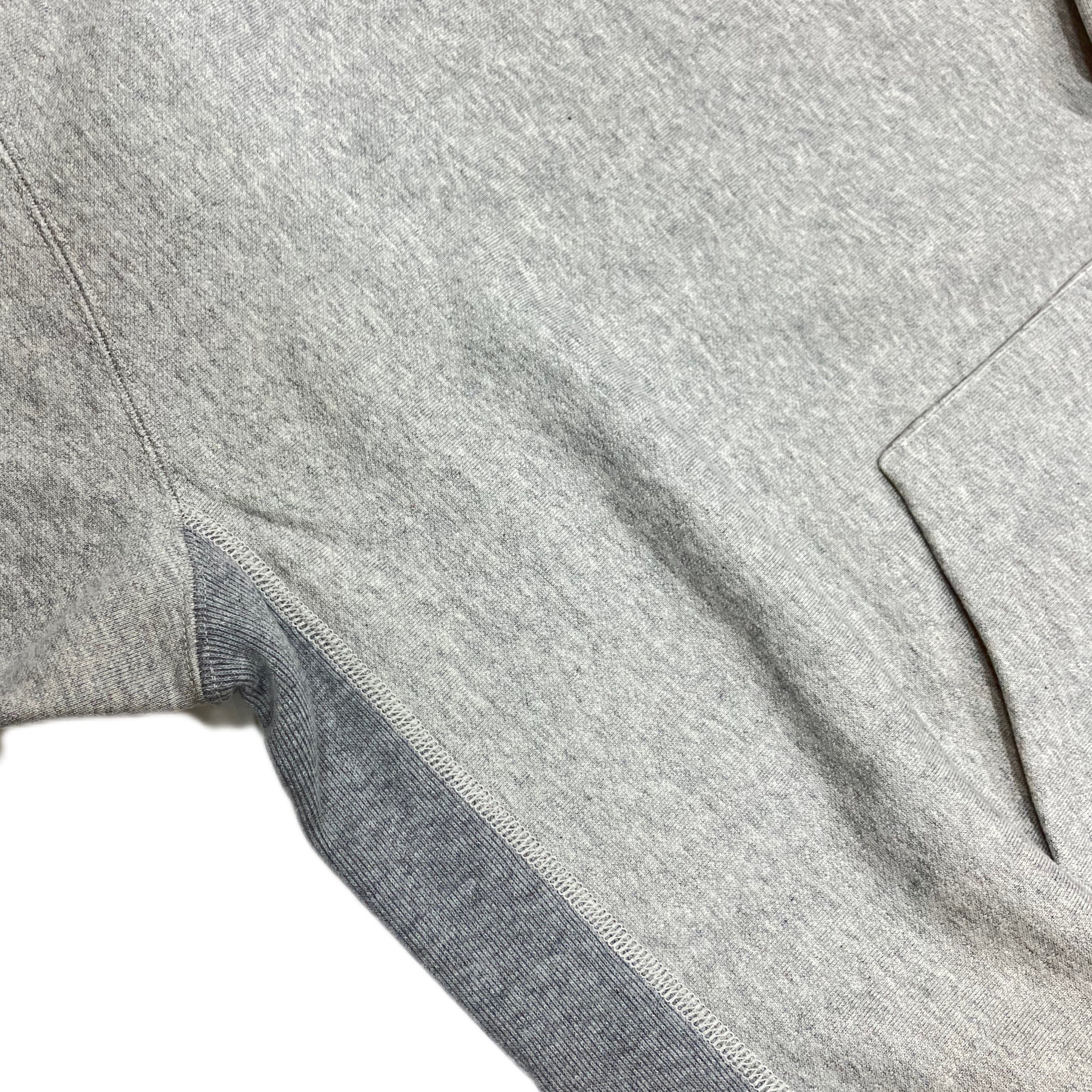 WORKERSさんの新作は80年代〜90年代位のトリコタグのクルーネックとパーカが元ネタです。前Vは、はめ込み式のガゼット。スエット生地は縦方向↑に縮みが出やすいという事もあり、身頃は横方向←→で裁断してあります。脇に伸縮性のあるリブパーツを切り替えでセット。身頃が横方向→←に縮んでも大丈夫という構造のスエットです。